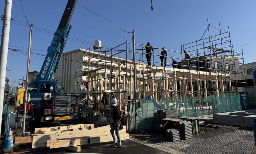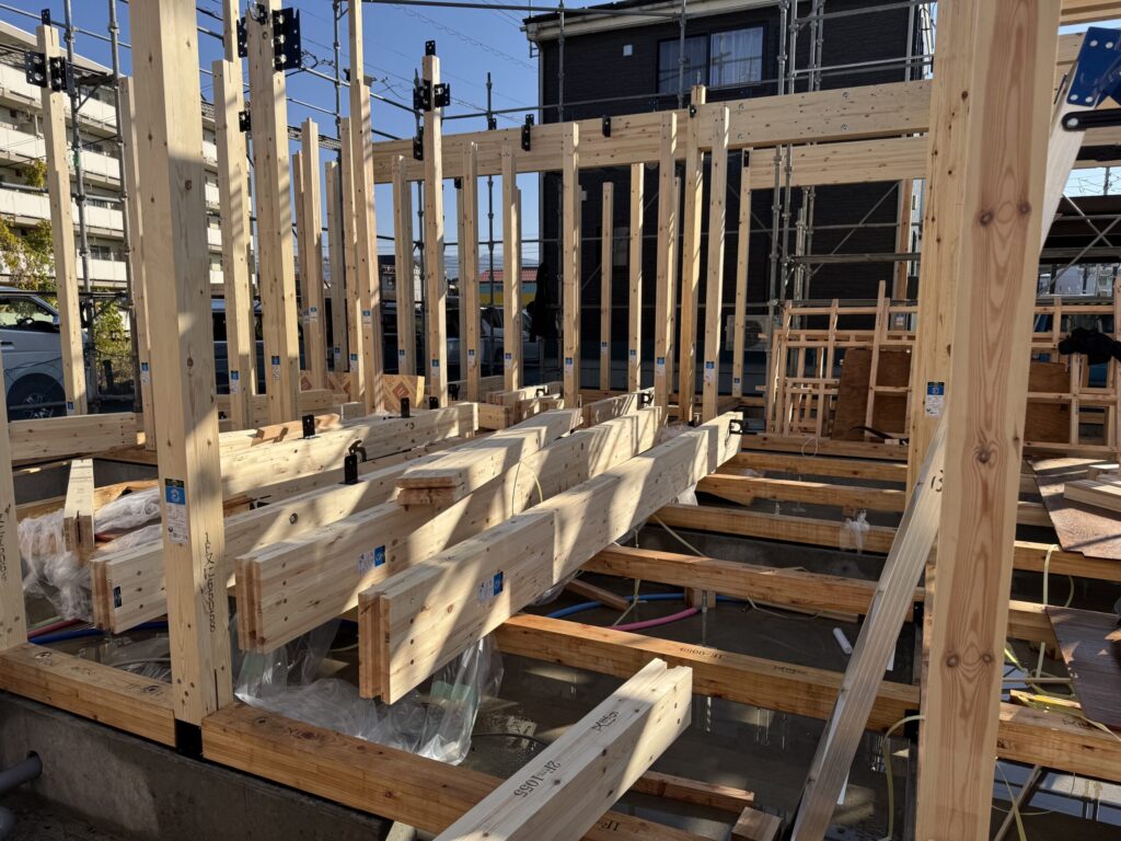 家の基礎しかない状態から、一気に骨組みが出来上がり、家の形になるので、工事の進捗を実感できる工程でもあります。