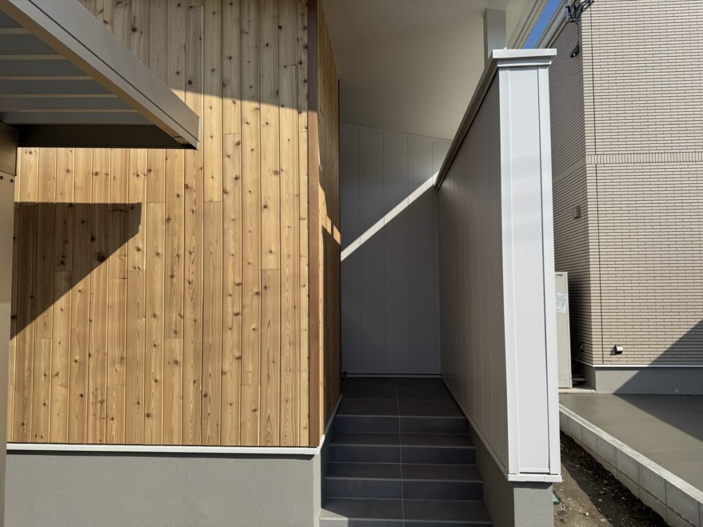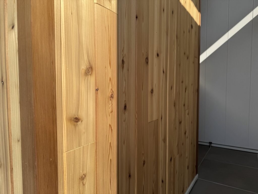 玄関の横の壁はレッドシダーの木材を貼っています。