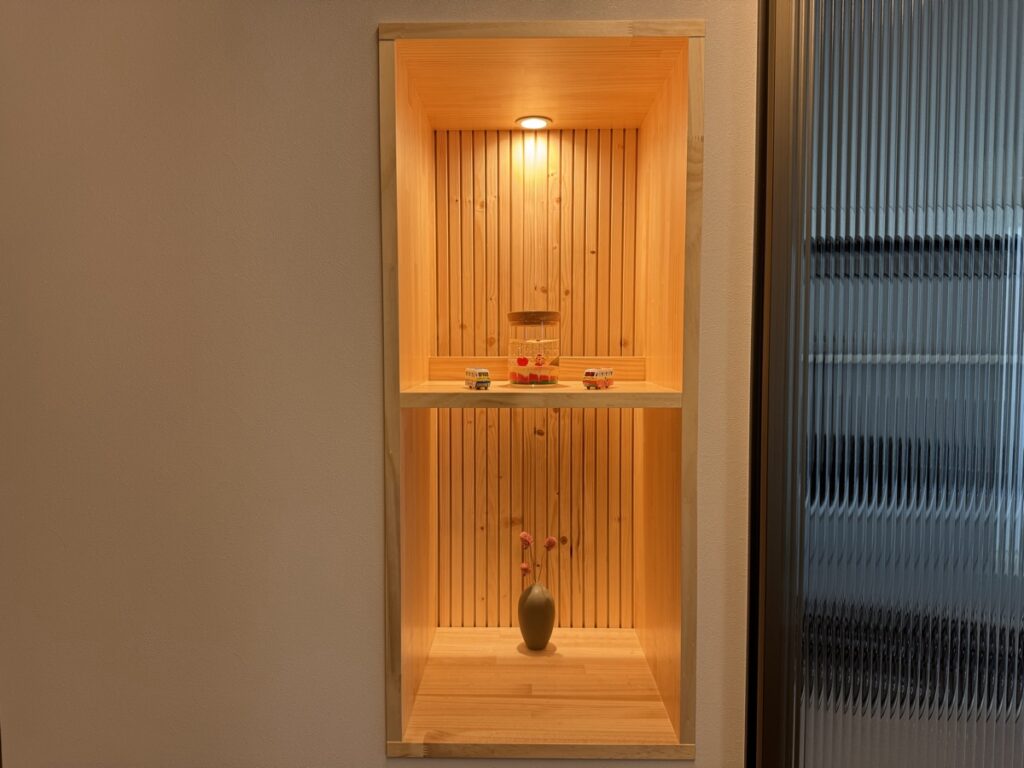 また、ワンポイントとして、玄関が入ると見える位置に飾り棚を作っています。