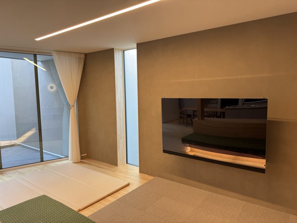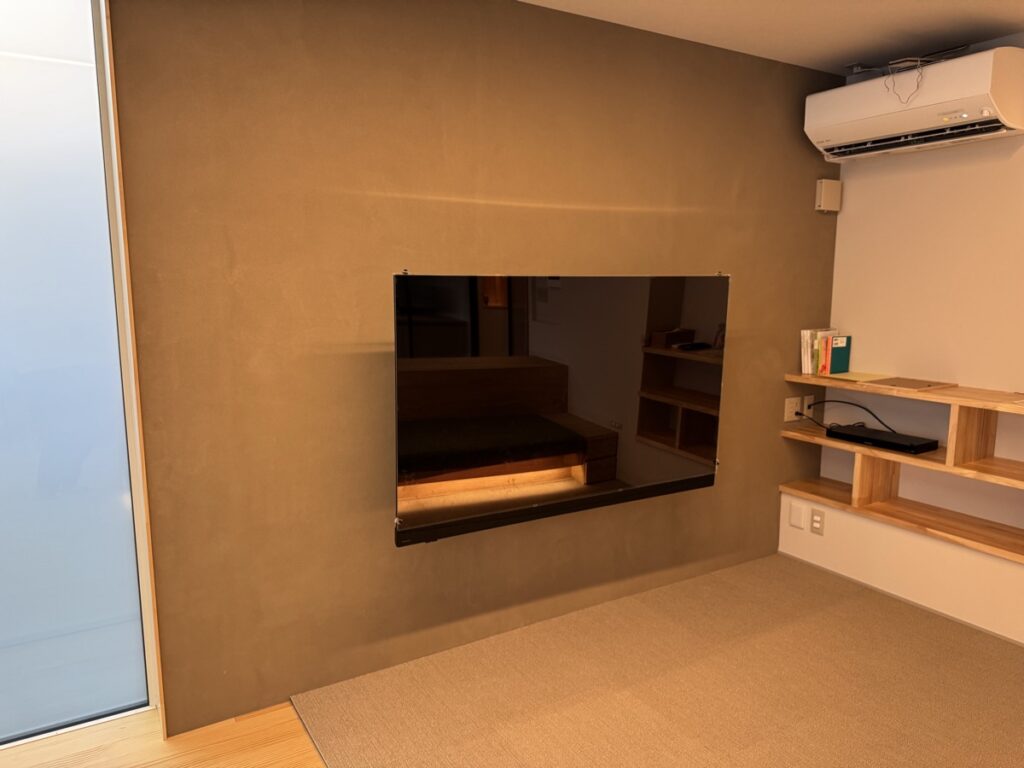 テレビは壁掛けにしており、塗り壁の良さを邪魔しないようにしています。