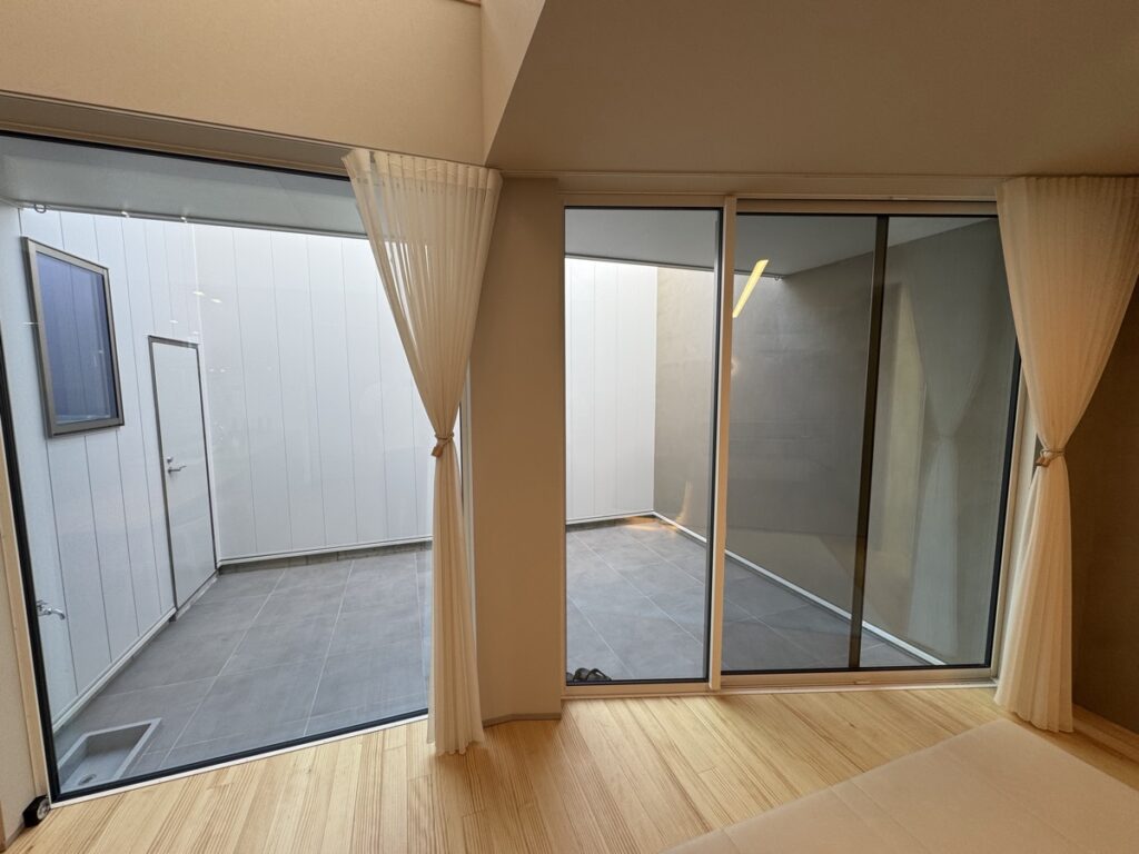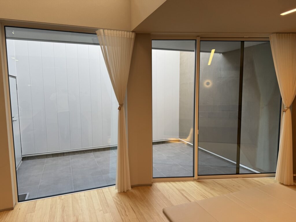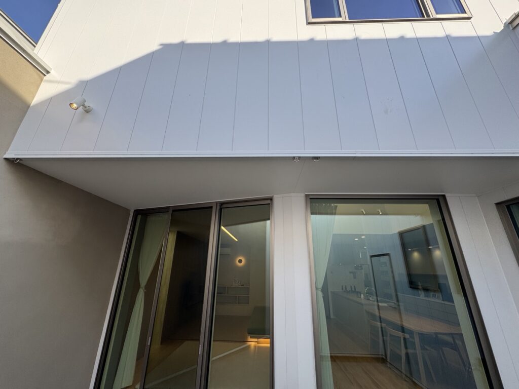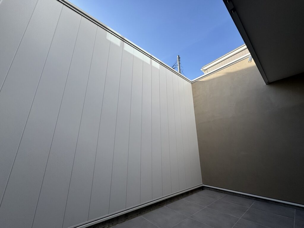 テラス空間は外壁と同じガルバリウム合板の白い壁で3mほどの高さで囲ってもらっており、完全にまわりからの視界を遮って、プライベート空間を実現しています。