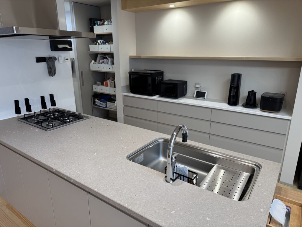 ストーン系の天板は高級感が出て、料理をしていてテンションが上がるので、料理が好きな人は少しお金はかかりますが、おすすめの設備です。