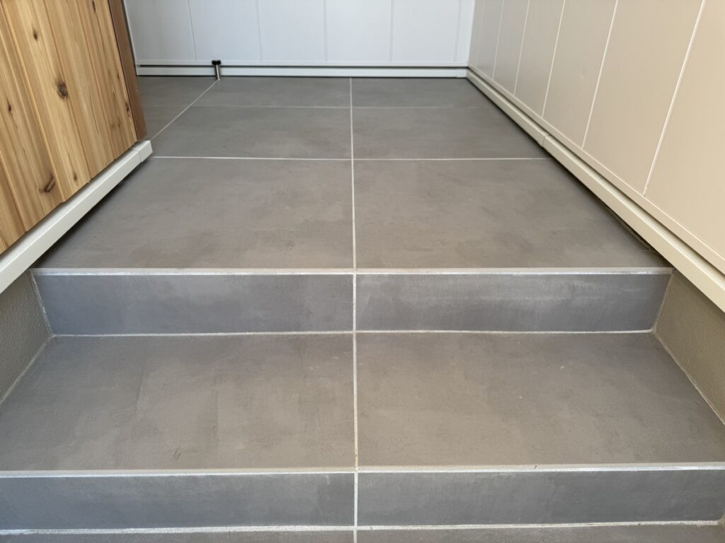 玄関周りは大きめの 60cm × 60cm のグレーのタイルで仕上げてもらっています。