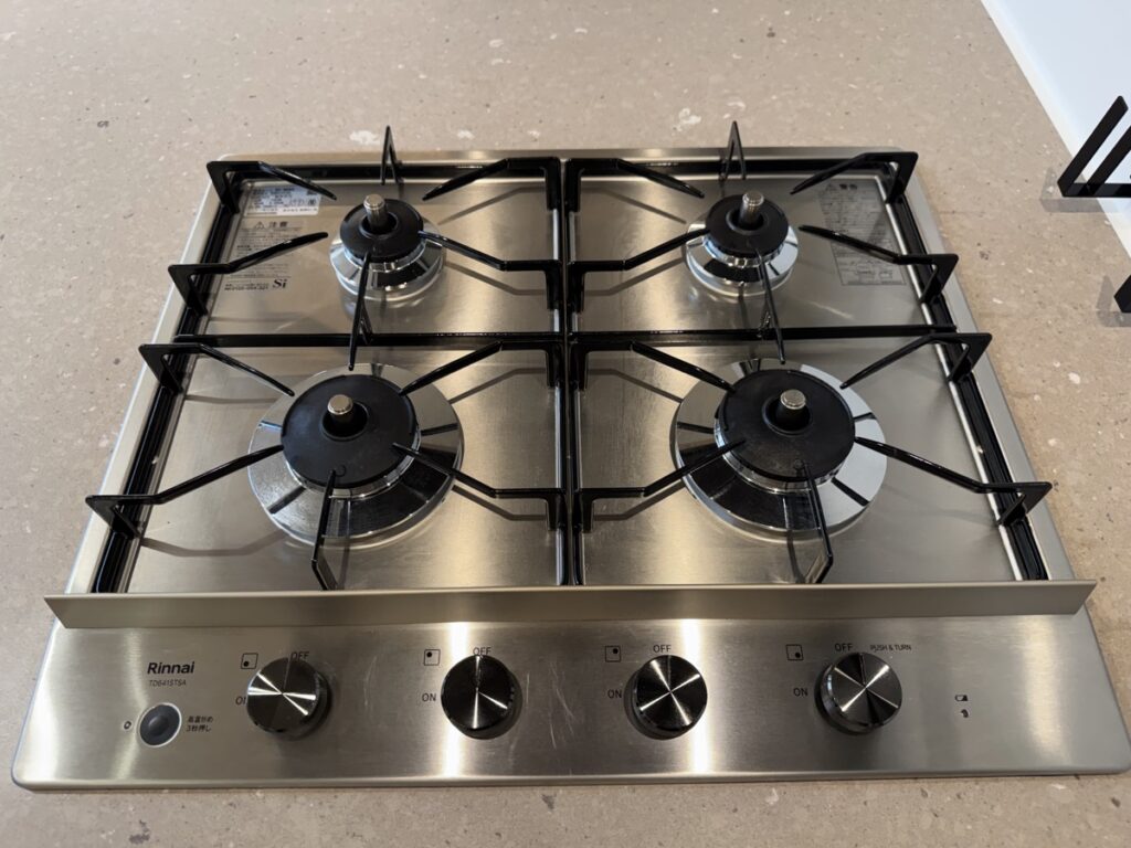 Rinnaiの4口コンロなのですが、見た目もスタイリッシュで小さめの鍋であればフルで4口置くこともできるので、料理もしやすく、キッチンをこだわりたい人にはおすすめの設備です。