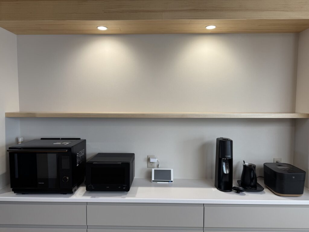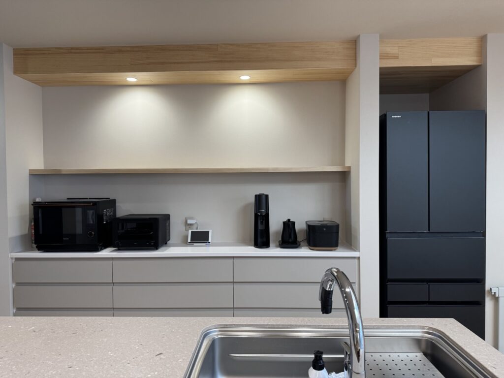 カップボードの家電や冷蔵庫はマットブラックでまとめており、ジャパンディな空間のワンポイントとしています。