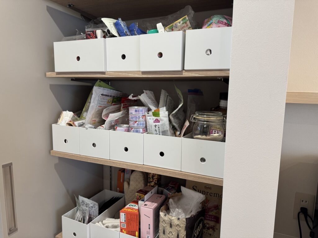 キッチン横にはパントリーを設けていて、可動棚で自由に高さを変えられる棚にしています。