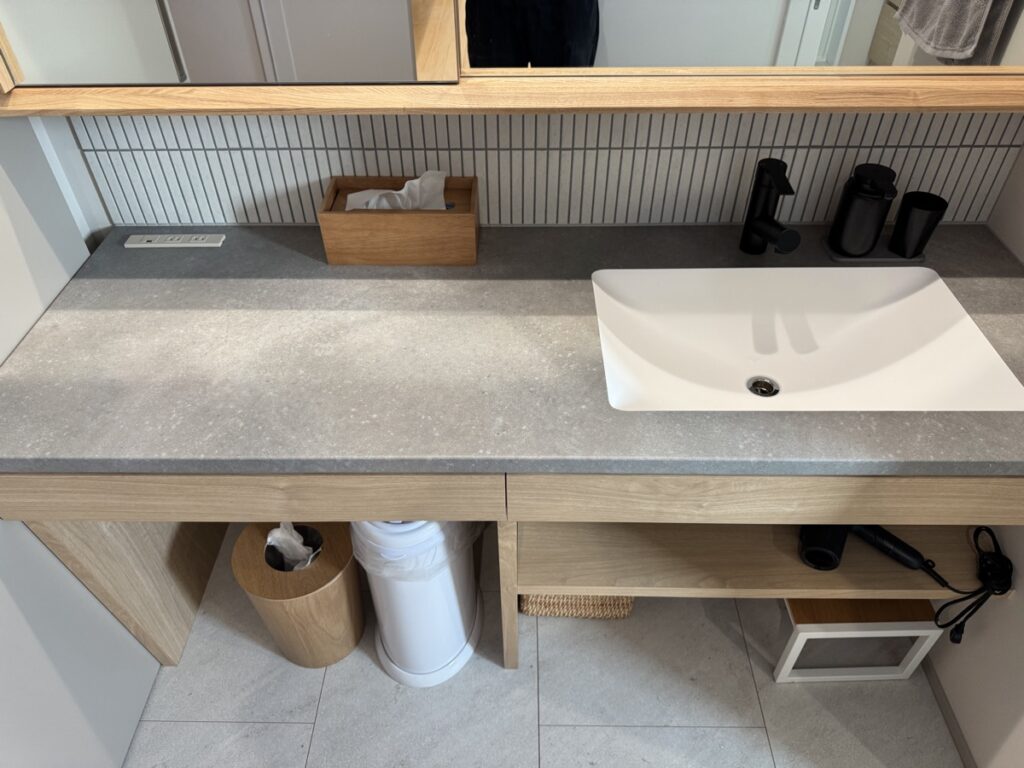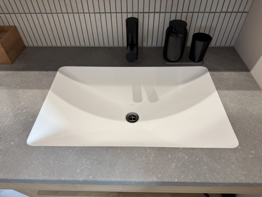 洗面スペースは造作洗面になっており、アイカ工業の洗面ボウルを採用しています。