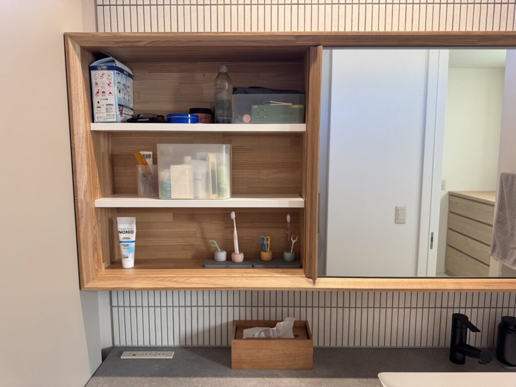 鏡はスライドできる扉になっており、正面に化粧品類や歯ブラシなどを隠して収納できるようにしました。