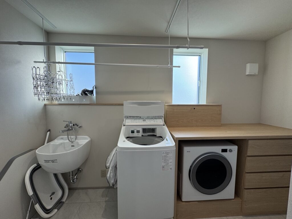 ランドリールームは洗濯機、乾太くん、スロップシンク、前後に稼働できる物干し竿を設置しており、ランドリールームを設置するかを検討する設備はほぼ設置しています。