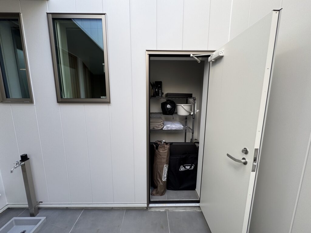 外部収納も設けており、ここにテラスで使う椅子や机、バーベキューグッズなどを収納できます。
