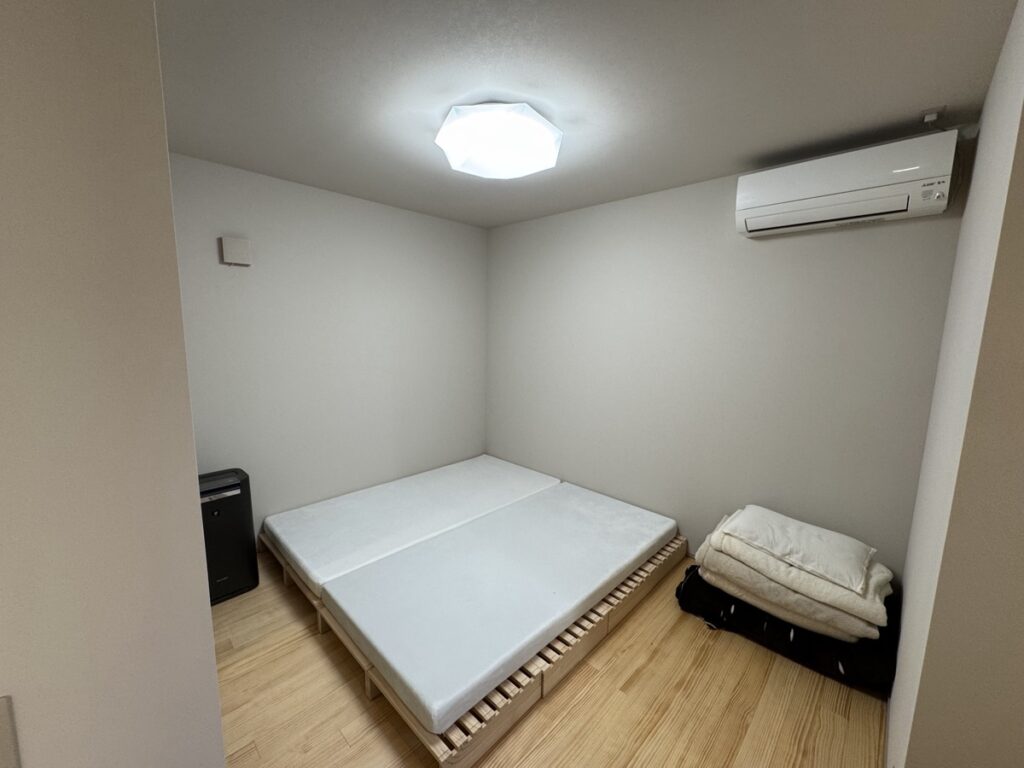 子供が小さいうちは3枚のシングルのマットレスと敷いて、みんなで寝れるようにして、子供が大きくなってからも夫婦で広く使えるように意識しています。