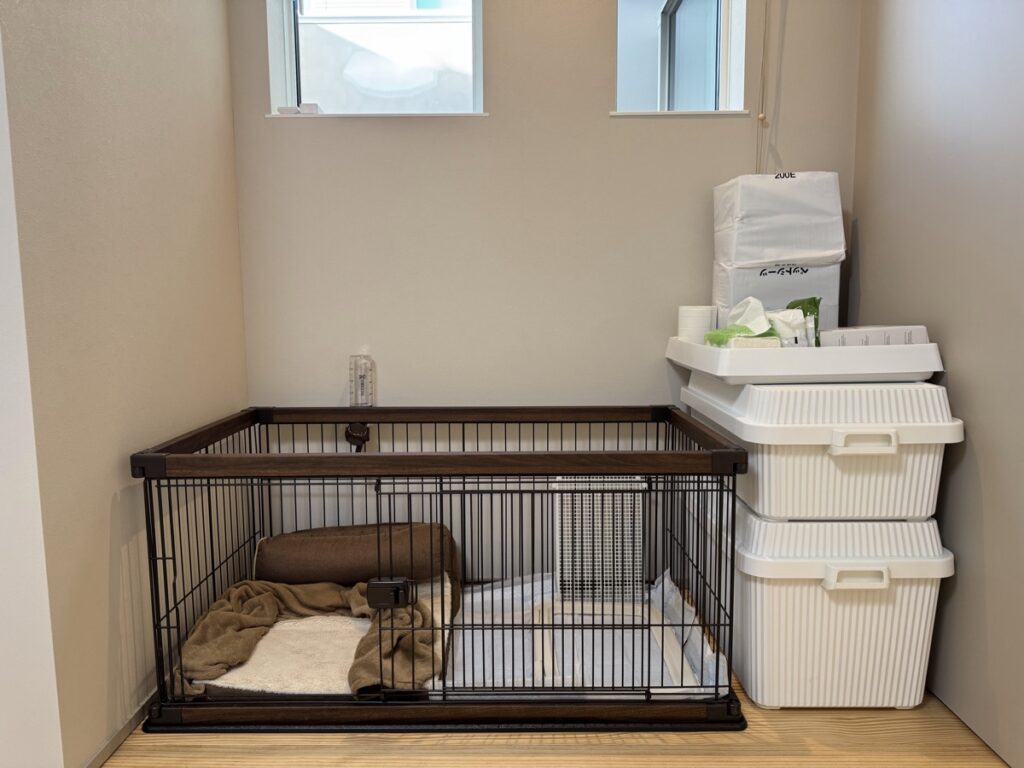 また、ペットがいたので、同じ空間で寝れるようにサークルを置けるスペースを設けました。