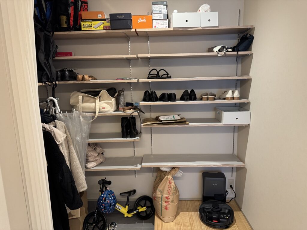 可動棚を設置してもらい、収納する物のサイズや靴の高さに応じて、柔軟に収納を変更できるようにしています。