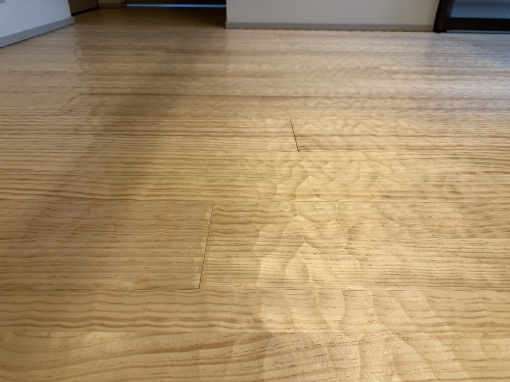 特に我が家は、1歳/2歳の子供がいるので、容赦無くおもちゃを叩きつけて、よく遊んでいるところの床は入居1ヶ月でこの有様です…。