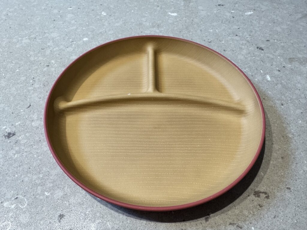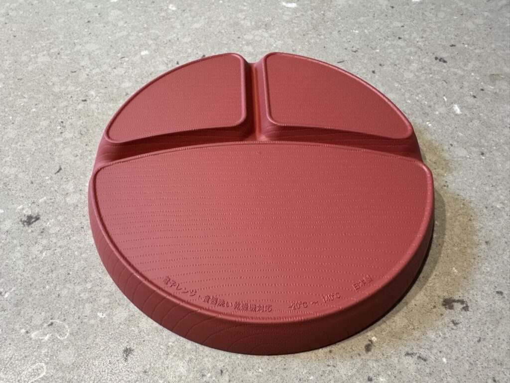 幼児用の平皿は仕切りがついていて、少し汁がある副菜やメイン料理も1皿で盛り付けができます。