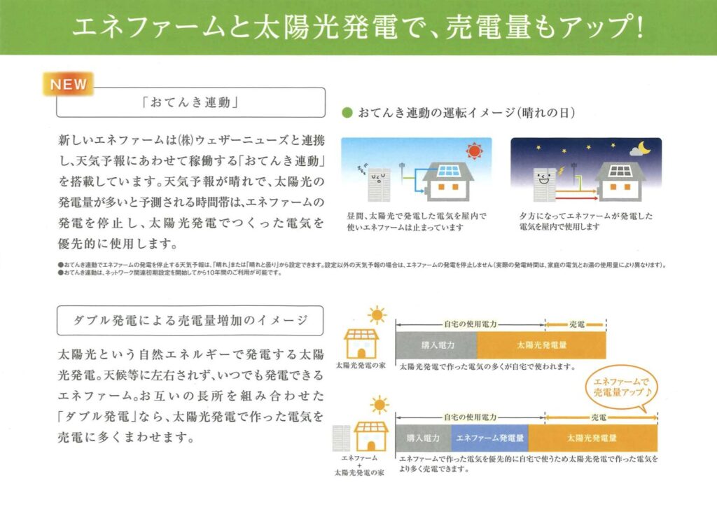 そして、我が家は太陽光発電も導入しているのですが、最近のエネファームは天気予報(ウェザーニュース社提供)と連携して、エネルギー効率が最大になるように稼働してくれます。
